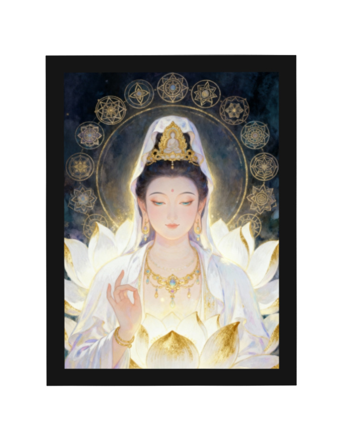 Inspired by Eastern spirituality and goddess archetypes of compassion, this artwork evokes the calming presence often associated with Guanyin-style imagery, without excess detail—making it timeless and universally soothing. The luminous palette and symmetrical mandala patterns create a tranquil focal point ideal for mindfulness, prayer, and inner restoration.