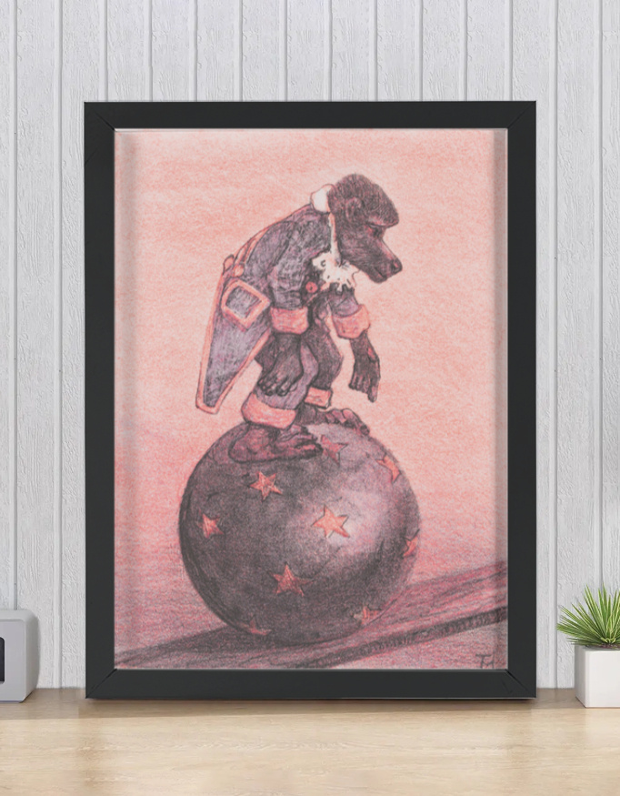 The playful yet contemplative pose evokes themes of balance, curiosity, and quiet determination, making it a captivating choice for art lovers, collectors, and creative interiors. The warm, muted tones and hand-drawn texture suit a wide range of spaces, from eclectic living rooms and cozy reading nooks to nurseries, studios, and gallery walls.