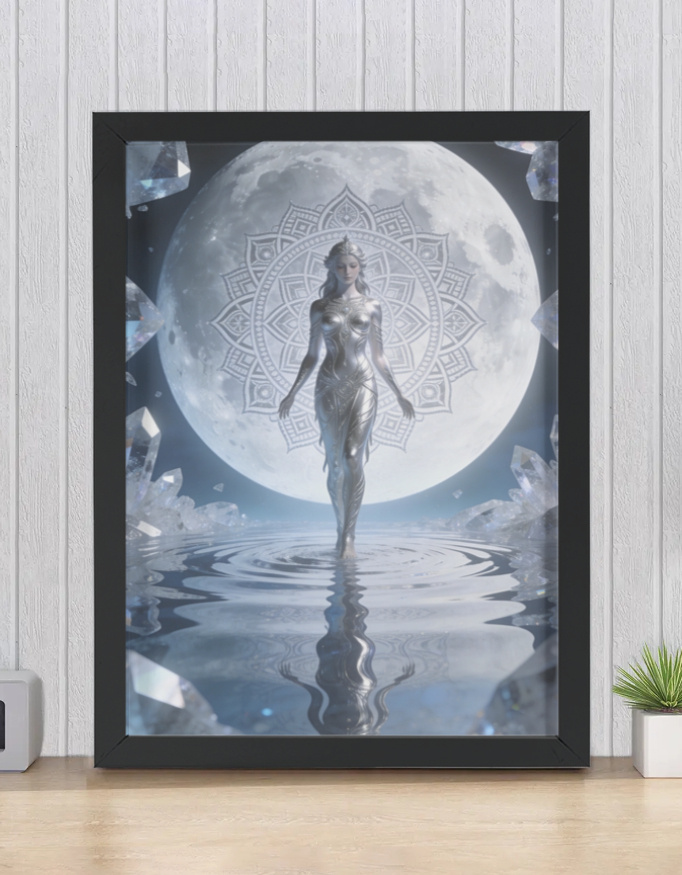 Perfect for framed or unframed wall display, this lunar spiritual wall decor enhances bedrooms, meditation rooms, yoga studios, healing spaces, and contemporary homes. Its symmetrical mandala and moonlit reflection make it especially appealing to collectors of celestial wall art, goddess imagery, and modern mystical design.